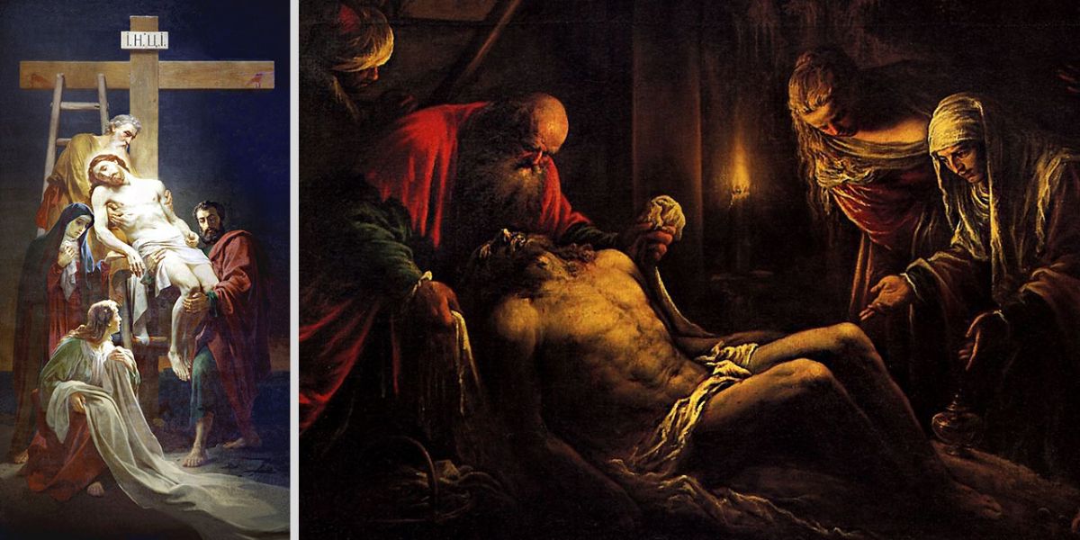 Никодим и Иосиф погребают Христа.