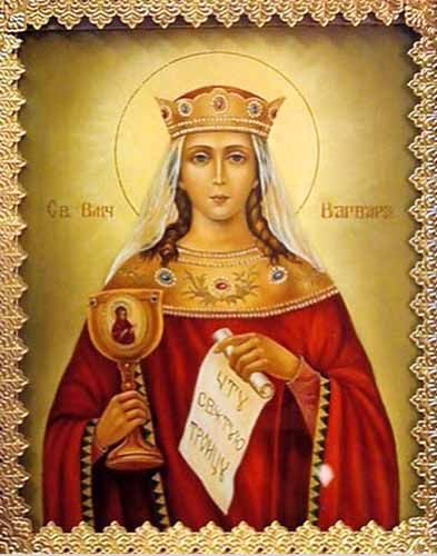 Премудрая и всекрасная святая великомученице Христова Варваро! Блаженна еси, яко Премирная мудрость Божия плоть и кровь не яви тебе, но Сам Бог, Отец Небесный, Иже тебе, веры ради от невернаго отца оставленную, изгнанную и умерщвленную, в дщерь Себе возлюбленную прият; за тленное земнаго имения наследие плоти нетление дарова; труды мученическия упокоением Небеснаго измени Царствия; временное твое житие, смертию Его ради пресеченное, сицевою воспрослави почестию, яко душу с лики Небесных вчини духов, тело же, на земли в храме их ангельском положенное, Ангелом заповеда сохранити цело, честно и многочудесно. Блаженна еси, Христу Сыну Божию, Жениху Небесному, уневещанная дево, Егоже доброты твоея Рачителя имети желающи, всю себе страданием, ранами, удов резанием и самыя главы усечением, аки утварьми дражайшими, потщалася еси украсити: да тако, яко жена, верна главе своей - мужу, Христу духом и телом соединишися неразлучно, глаголющи: "Обретох, Егоже возлюби душа моя, удержах Его и не оставих Его". Блаженна еси, яко Святый Дух на тебе почил есть, имже духовными духовная разсуждати научена, вся духи лукавствия во идолех яко пагубныя отринула еси и Единаго Бога Духа познавши, яко истинная поклонница, духом и истиною кланятися изволила еси, проповеднически глаголющи: "Троицу чту, Едино Божество". Сию Святую Троицу, Юже в животе и смерти исповеданием и страданием своим прославила еси, умоли о мне, предстательнице моя, яко да и аз всегда тройственною веры, любве и надежды добродетелию, Туюжде Святую Троицу почитаю. Имам светильник веры, но празден благих дел елеа; ты, мудрая дево, страдальческую плоть твою, крове исполненную и ранами преливающуюся, аки светильник имущая, даждь от елеа твоего, да тем душевную мою свещу украсивши, сподоблюся по тебе в Чертог Небесный внити. Пресельник аз есмь на земли и пришлец, якоже вси отцы мои; благ вечных наследнице и блаженныя вечери в Царствии Небеснем причастнице, яко в странствии жития, Трапезы Божественныя угодения, сице и во исходе от мира желаемаго сподоби мя напутствования; и егда в конец сном смерти начну усыпати, коснися тогда изнемогающия плоти моея, яко иногда Ангел Илии, глаголющи: востани, яждь и пий; яко да благодатию Божественных Тела и Крове Тайн укреплен, преиду в крепости яди тоя далекий путь смерти, даже до Горы Небесныя: и тамо, Егоже ты чрез три окна банныя прежде верою Бога Троицу узрела еси, Сего купно с тобою лицем к лицу да удостоюся видети и славити Его в некончаемыя веки. Аминь.