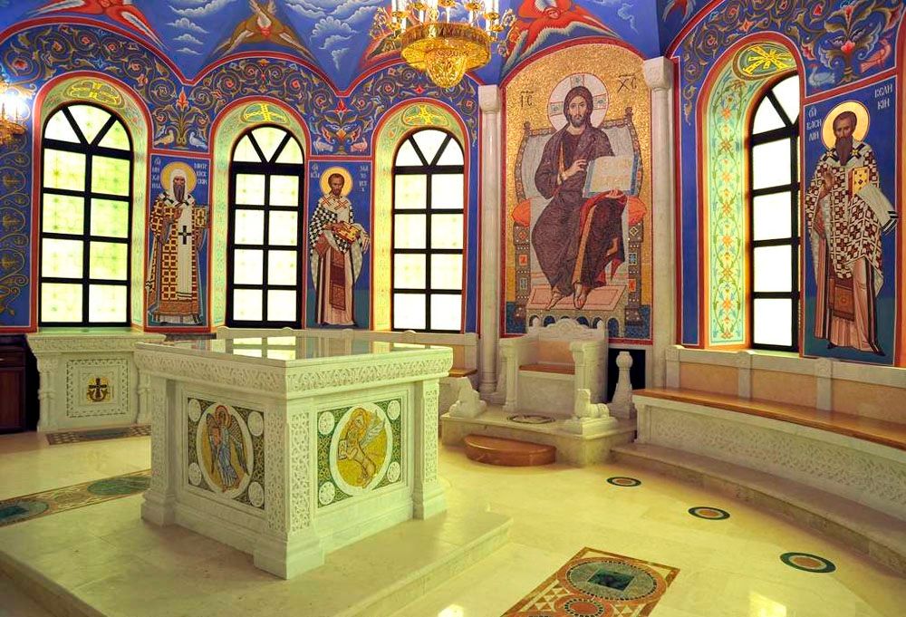 Внутри алтаря находится главная святыня: престол. Это особо освященный стол. На нем находятся семисвечник, ковчег с запасными святыми Дарами, Евангелие, кресты.