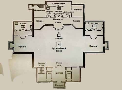 Как и древний Иерусалимский храм, православный храм состоит из трех частей: алтаря, среднего храма (или просто храма) и притвора (или трапезной). Кроме того, храм может иметь один или несколько дополнительных приделов со своими алтарями.