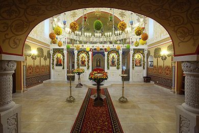 Перед праздничными аналоями и чтимыми иконами ставят подсвечники для возжигания на них свечей верующих. С потолка свисают большие красивые паникадила со множеством лампочек, зажигаемых в торжественные моменты службы.