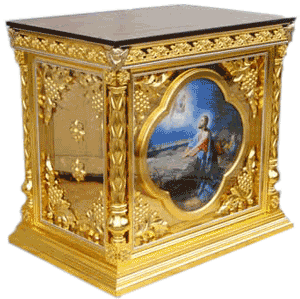 Здесь же, налево от престола, стоит жертвенник - небольшой стол, на котором приготавливаются Дары для таинства Причащения.