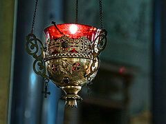 Масляный светильник, представляющий собой сосуд с фитилём, наполняемый маслом; зажигаемый перед иконами, на престоле и семисвечнике.