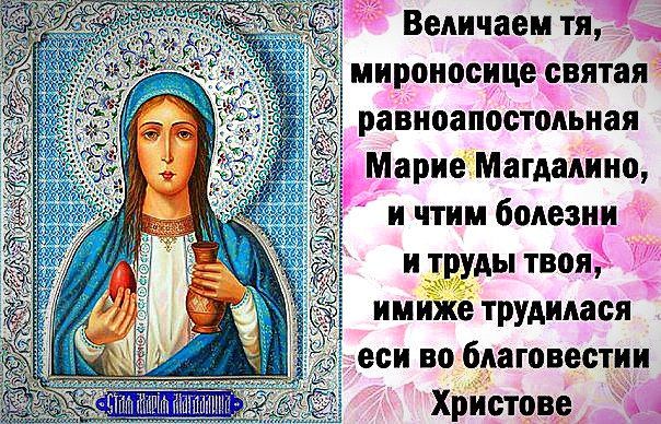 Велича́ем тя,/ мироно́сице свята́я равноапо́стольная Мари́е Магдали́но,/ и чтим боле́зни и труды́ твоя́,/ и́миже труди́лася еси́/ во благове́стии Христо́ве.