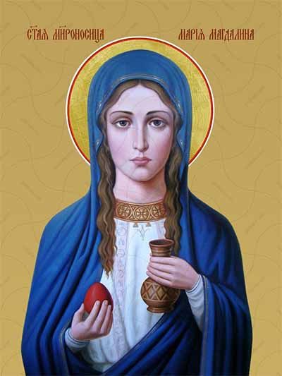Прозвище Мария произошло от города, в котором она родилась – Магдала. В Новом завете о ней говорится совсем немного – всего в нескольких эпизодах упоминается имя Магдалины. Так, повествуется о том, как она была одержима семью бесами, но их изгнал из Марии Христос, и так она начала служить ему и сопровождать Спасителя. Видела она и его казнь, а после вместе с другими женами-мироносицами пришла к его телу с ароматными маслами. Она же удостоилась чести первой увидеть Христа воскресшим, и рассказала об этом его ученикам – апостолам. Далее Мария отправилась в Рим – проповедовать молодую христианскую веру рядом с Иоанном Богословом. Кончина ее в городе Эфес была мирной, спокойной. На русской земле Мария Магдалена почитается как равноапостольная святая.