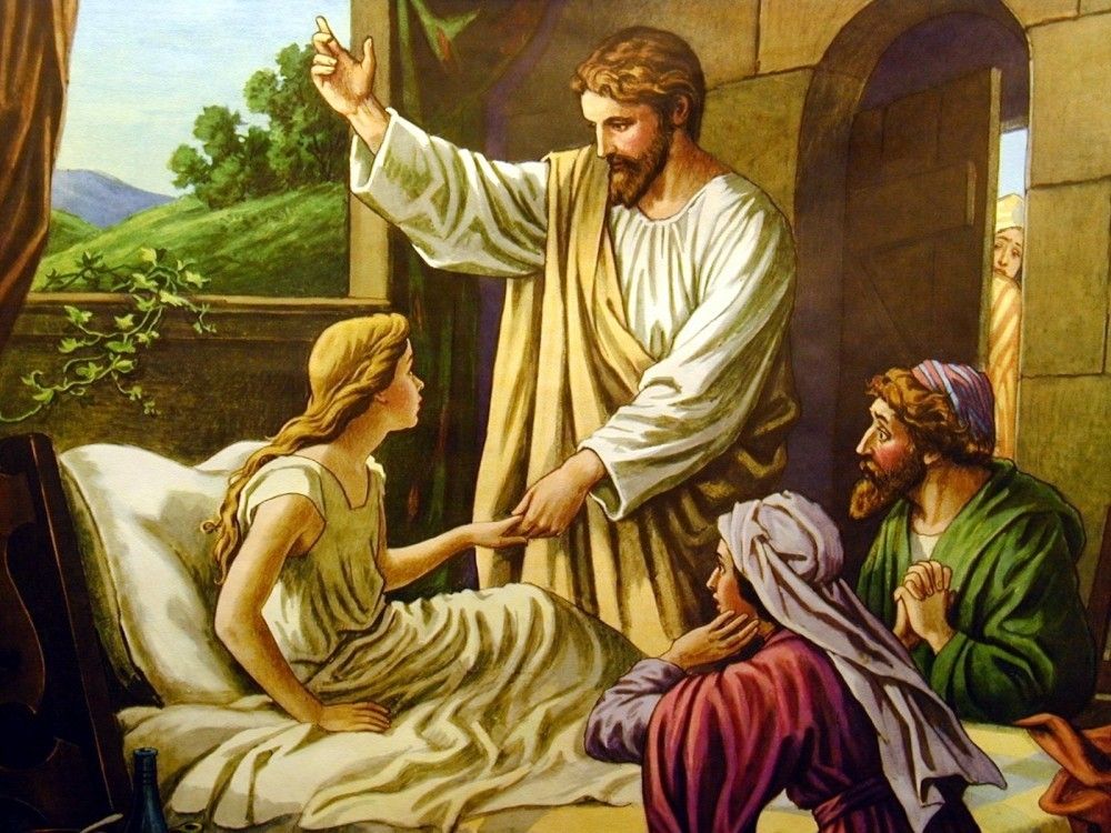 Ст. 35-43 Когда Он еще говорил сие, приходят от начальника синагоги и говорят: дочь твоя умерла; что еще утруждаешь Учителя? Но Иисус, услышав сии слова, тотчас говорит начальнику синагоги: не бойся, только веруй. И не позволил никому следовать за Собою, кроме Петра, Иакова и Иоанна, брата Иакова. Приходит в дом начальника синагоги и видит смятение и плачущих и вопиющих громко. И, войдя, говорит им: что смущаетесь и плачете? девица не умерла, но спит. И смеялись над Ним. Но Он, выслав всех, берет с Собою отца и мать девицы и бывших с Ним и входит туда, где девица лежала. И, взяв девицу за руку, говорит ей: «талифа куми», что значит: девица, тебе говорю, встань. И девица тотчас встала и начала ходить, ибо была лет двенадцати. Видевшие пришли в великое изумление. И Он строго приказал им, чтобы никто об этом не знал, и сказал, чтобы дали ей есть
