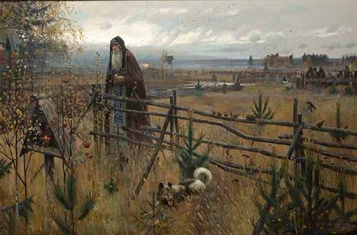 Затеплит лампады у икон, Вспомнит тех, кто страждет и гоним. По утрам над храмом перезвон: Ангел Литургию служит с ним! А случится — вдруг заглянет зверь Из лесу, свирепый и большой, — Отворит медведю инок дверь, Хлеб разделит, напоит водой. Инок Сергий тих и молчалив, Но по всей Руси идет молва: Чудотворен свет его молитв, Сила благодатная в словах! Тихий свет на Маковце-горе Радугой цветет над всей землёй: Это инок Сергий на заре Молится с небес о нас с тобой! «Отче наш! Молению внемли! Дух Святой, очисти и спаси! Сыне Божий! В этот грозный час Не остави каждого из нас!» Ирина Языкова "Труды преподобного Сергия", художник Михаил Васильевич Нестеров |