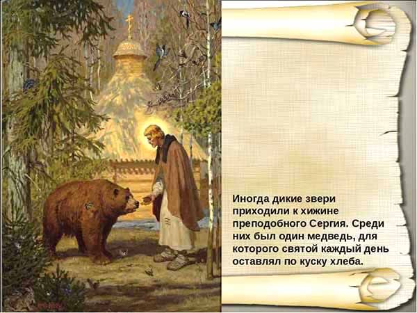 ❓Как вы думаете, чем он питался? Лесными дарами: ягодами, травами, иногда монахи из близ лежащего монастыря приносили ему еду. Этой едой Сергий иногда делился с лесными животными, которые приходили к нему в гости.
