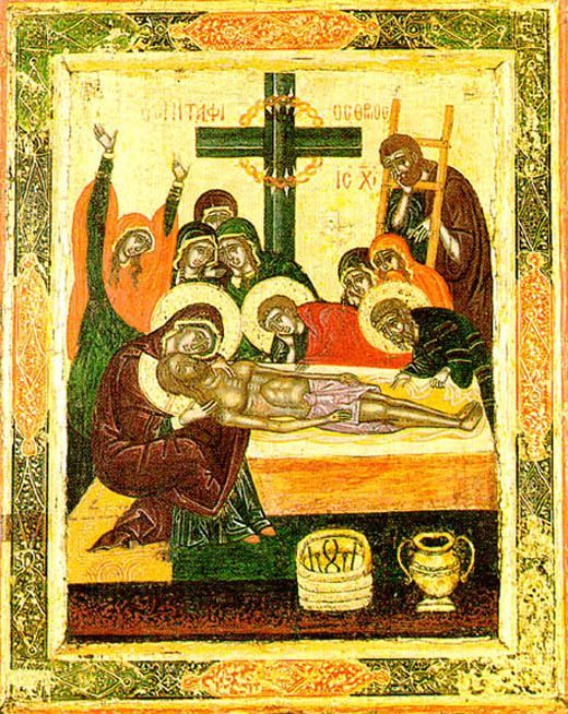 Иосиф с Никодимом сняли с Креста тело Иисуса, помазали Его благовониями и обернули в плащаницу.