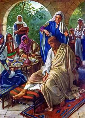 Жена-грешница, узнав, что Он возлежит в дому фарисеевом, приступила к Нему с алавастровым (алебастровым) сосудом мира цельного драгоценного и возлила Ему на главу, в знак своей любви и благоговения к Нему (Лк.7:36-50).