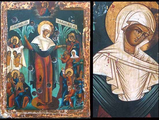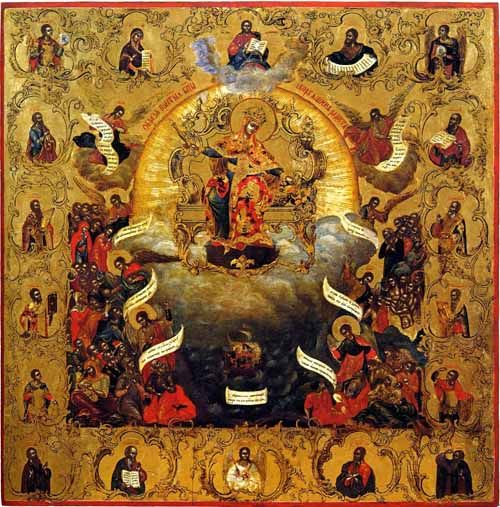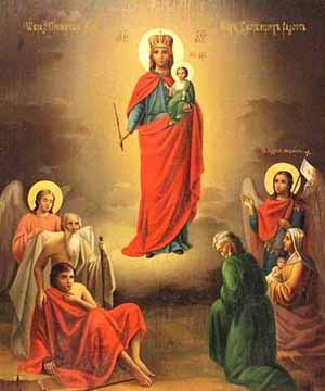 По вере людей в милосердие Богоматери к роду людскому, повелся обычай изображать Богоматерь сообразно тому, что слышится в словах молитвы к Ней: "О, Пресвятая Госпоже Владычице Богородице, вышши еси всех Ангел и Архангел и всея твари честнейши. Помощница еси обидимых, ненадеющихся надеяние, убогих заступница, печальных утешение, алчущих кормительница, нагих одеяние, больных исцеление, грешных спасение, христиан всех поможение и заступление".