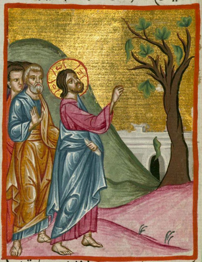 Входя в Иерусалим после ночного отдыха, Иисус увидел на дороге смоковницу. Она вся была покрыта листьями, но не имела плодов. Тогда Господь сказал: «да не будет же впредь от тебя плода вовек». И смоковница тотчас засохла» (Мф. 21:8-19)